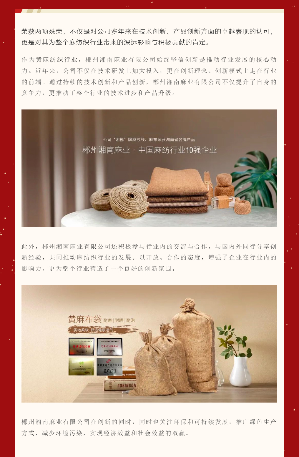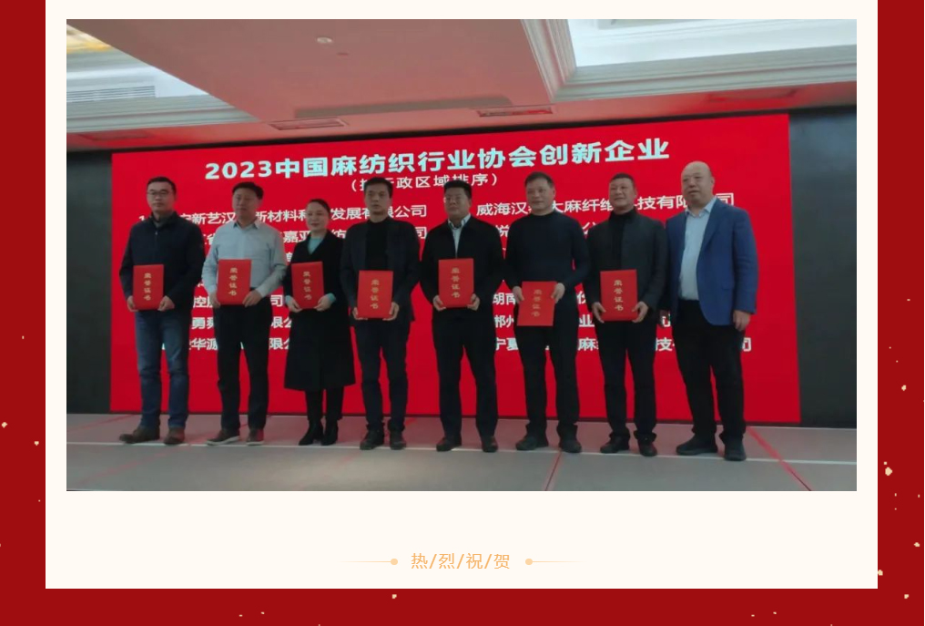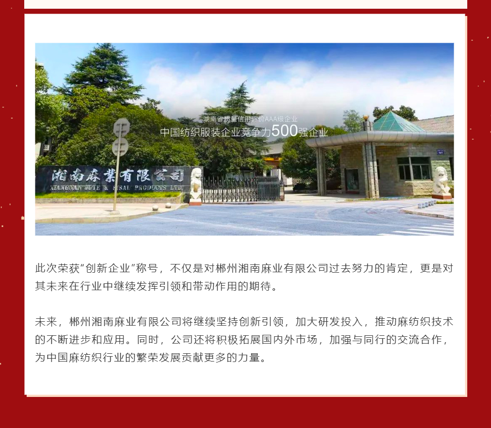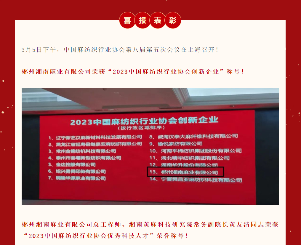 喜報|郴州湘南麻業(yè)有限公司榮獲2023中國麻紡織行業(yè)協(xié)會創(chuàng)新企業(yè)